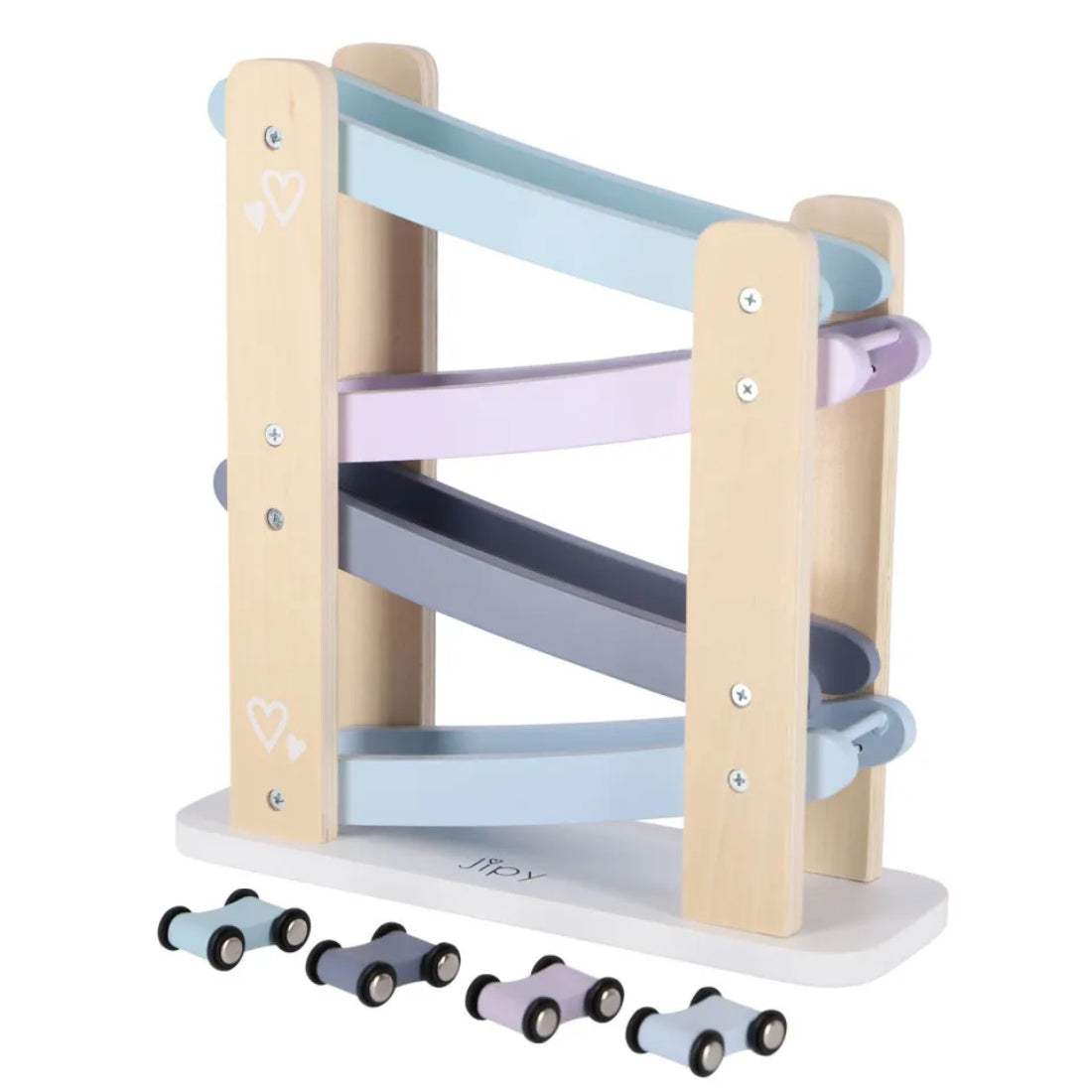 Die Rutsche verfügt über vier Ebenen, auf denen die mitgelieferten Fahrzeuge hinabfahren können.